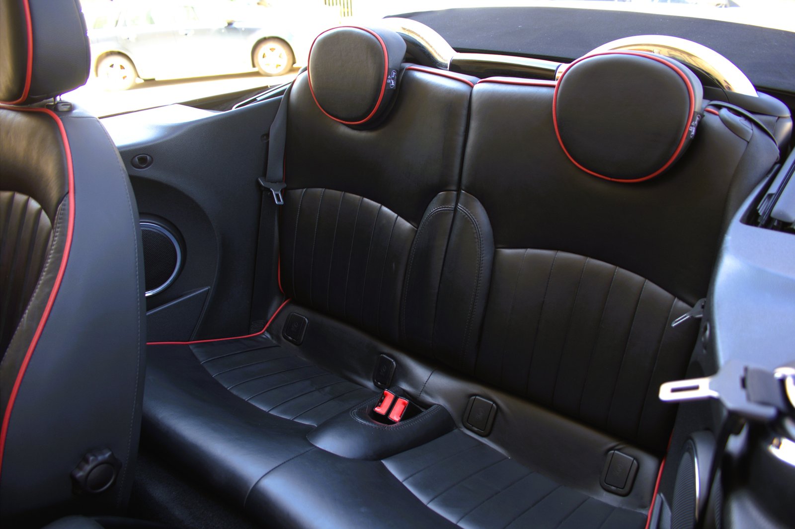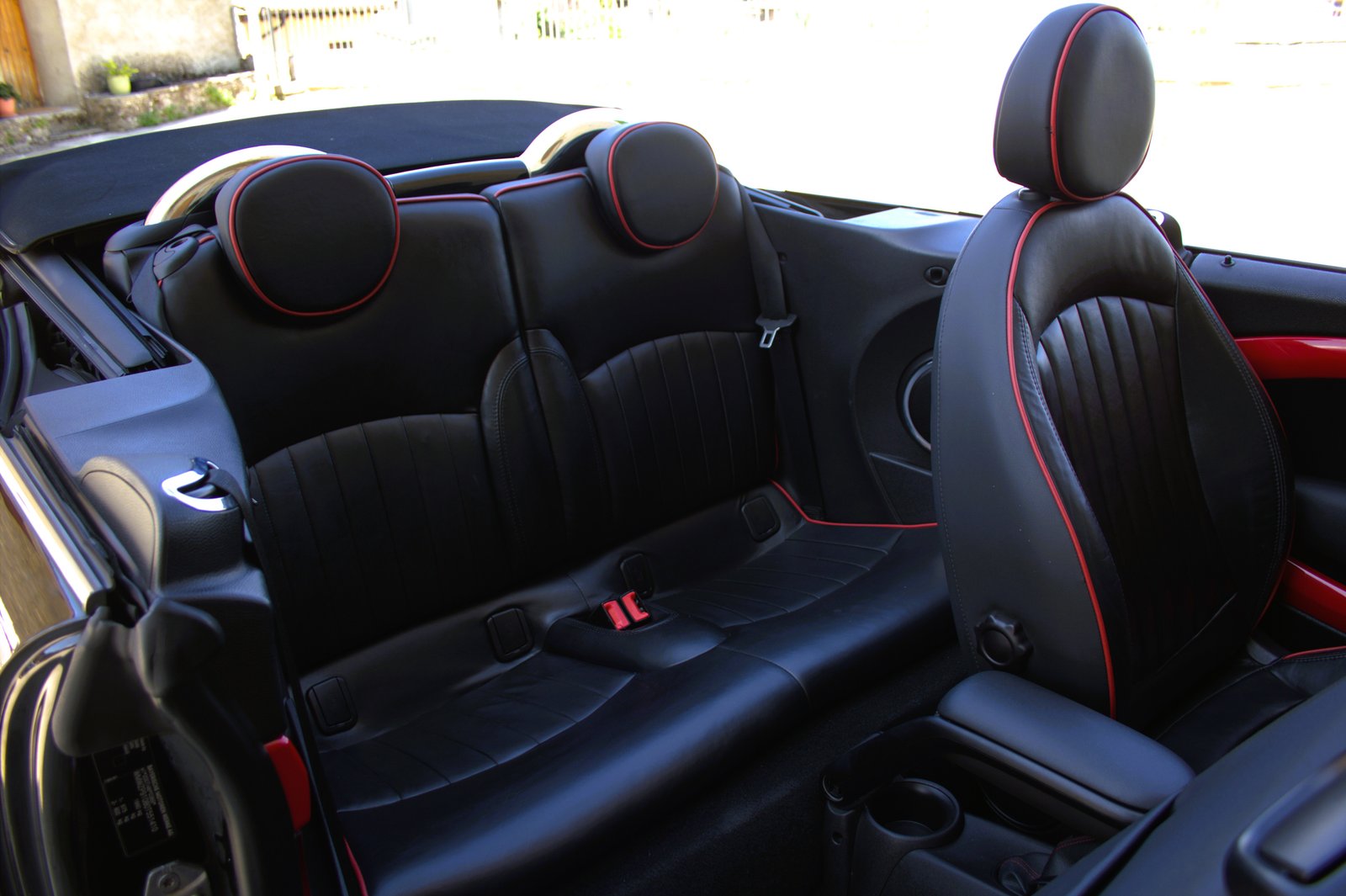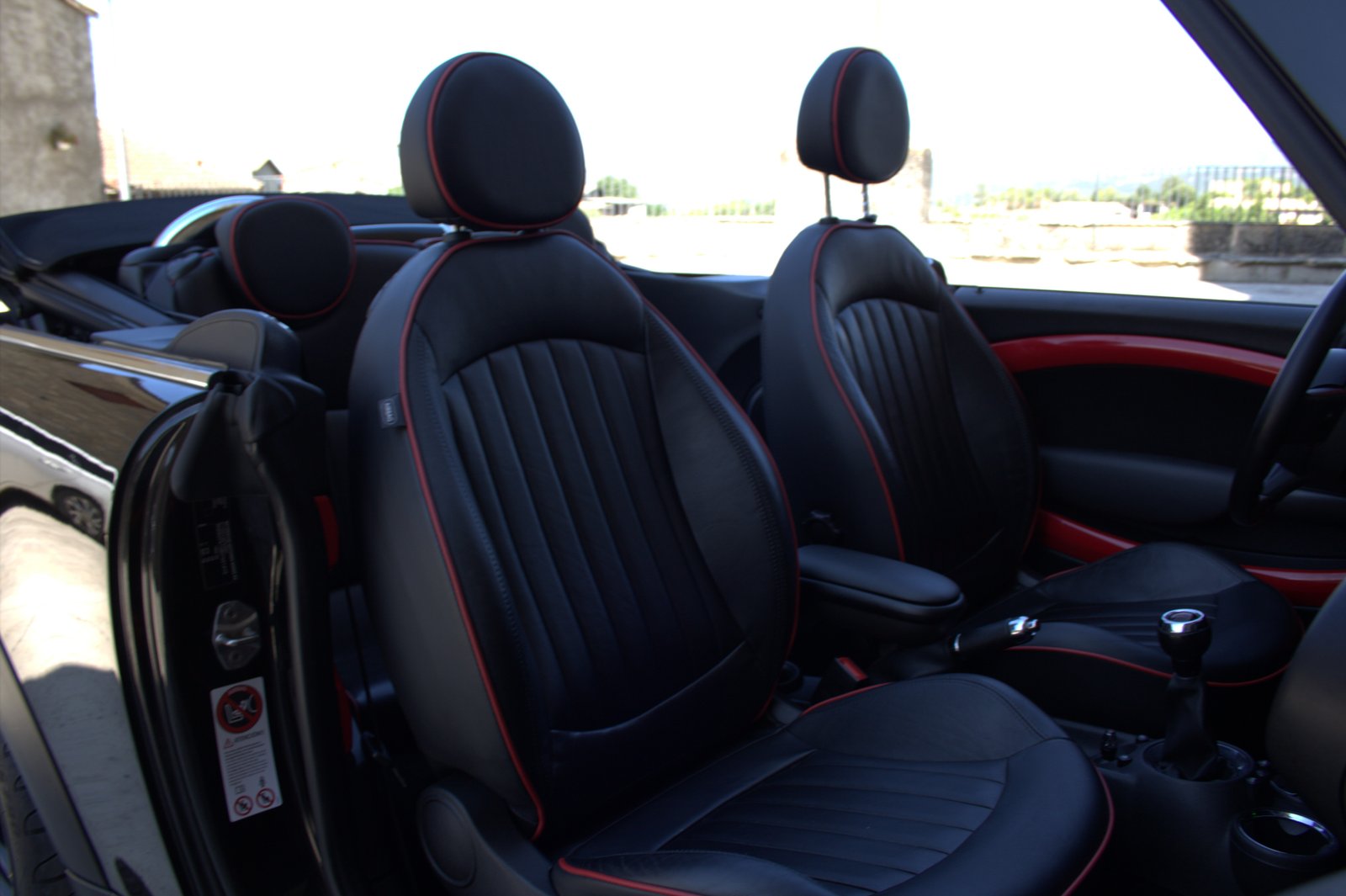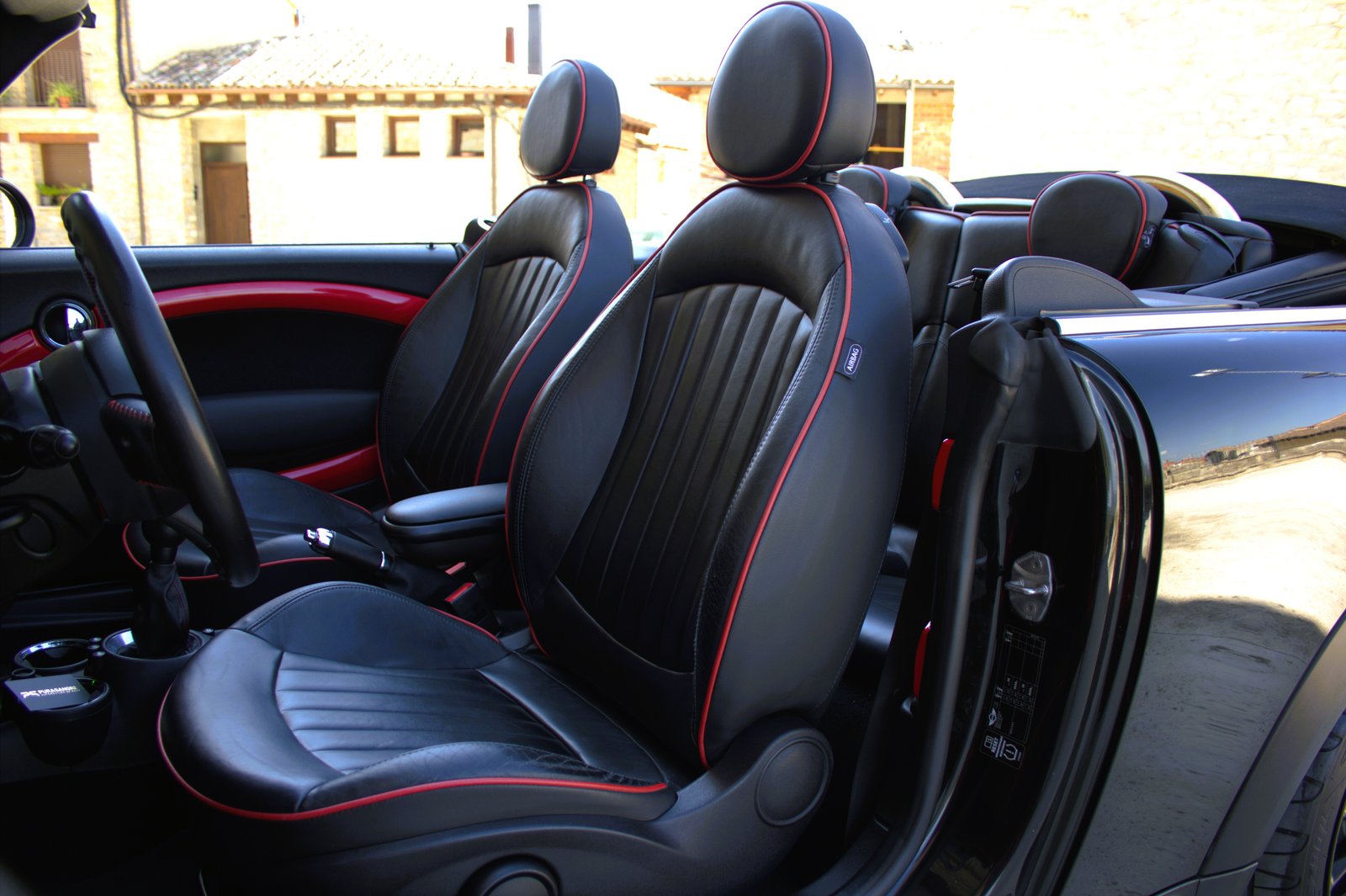 - Interior en cuero negro con ribetes en red chilli