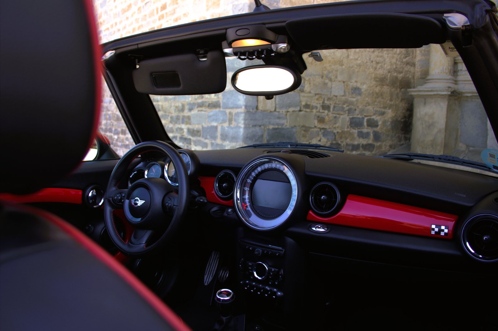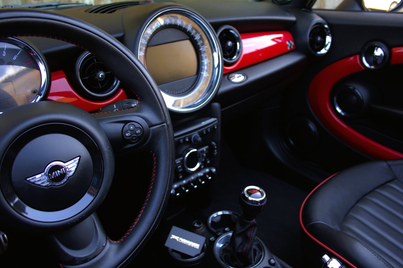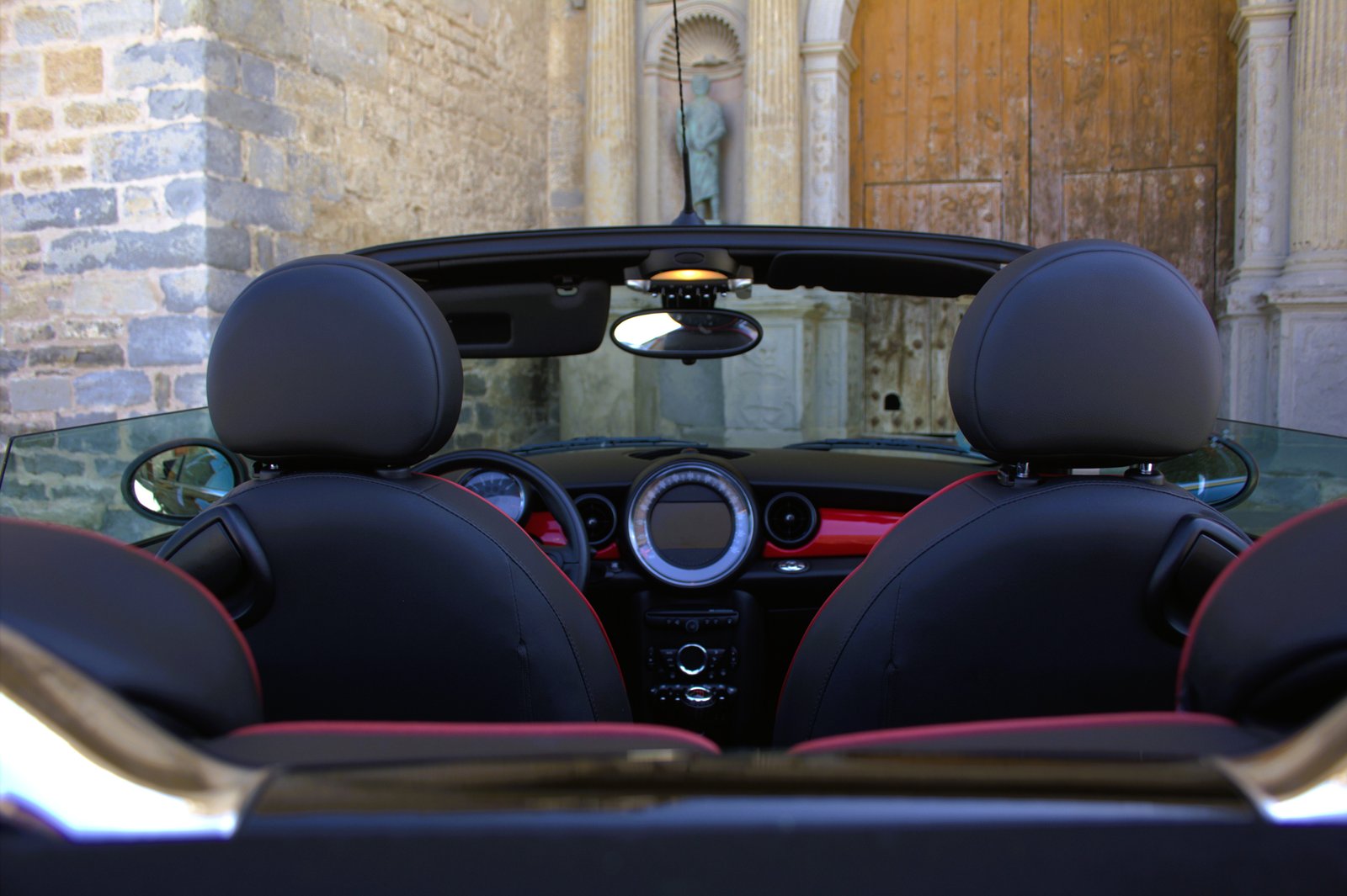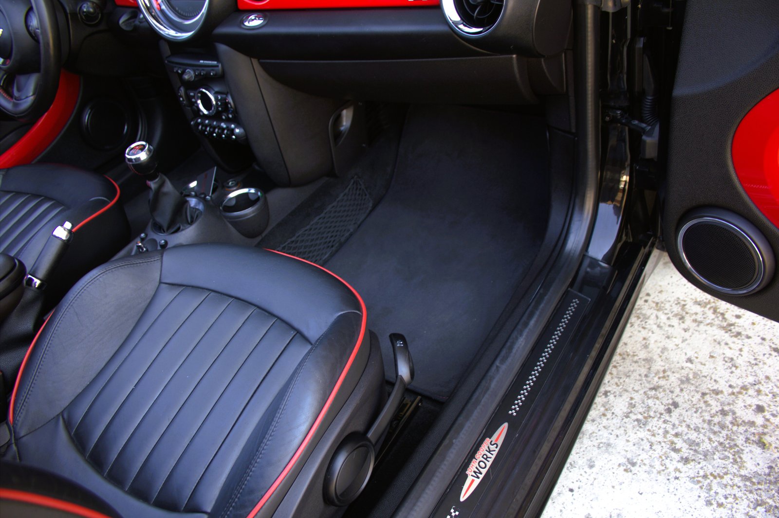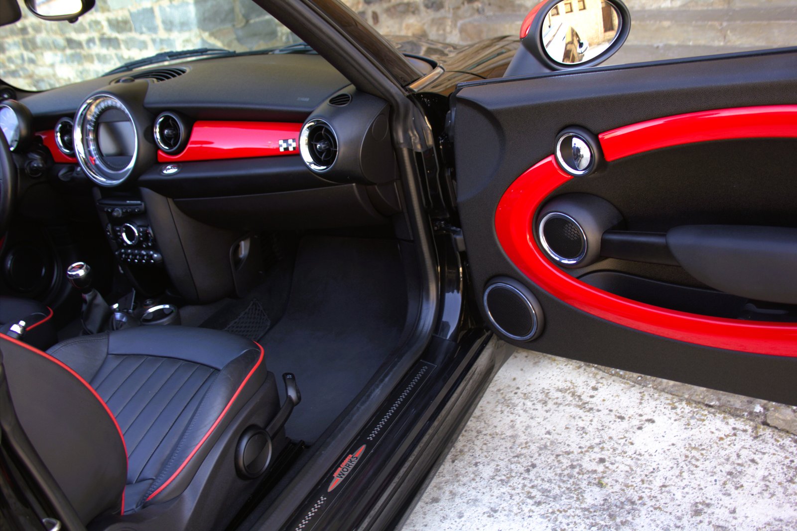 - Interior en cuero negro con ribetes en red chilli
